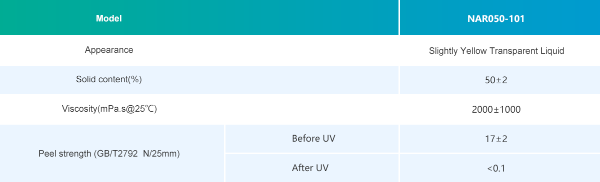 UV release adhesive is prepared by special monomer and synthetic process. After coating, it has high peeling strength before UV irradiation, and very low level peeling strength after irradiation. It is used for temporary protection and fixing during production.